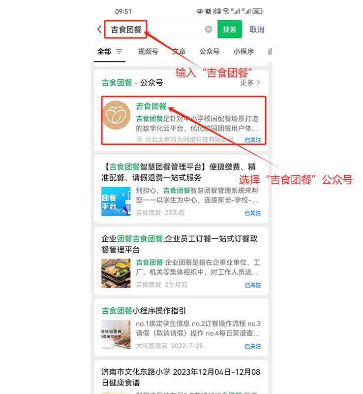 在保定市使用缴费平台供餐企业、学校和家长需要先关注“吉食团餐”公众号,已经关注的可以跳过这个步骤。